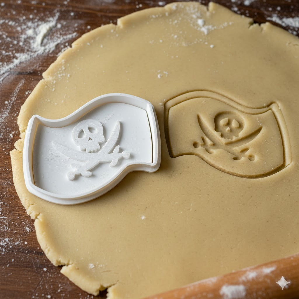 Emporte-pièce en forme de drapeau pirate avec tête de mort et os croisés. Parfait pour créer des biscuits thématiques pirates pour vos fêtes d'anniversaire, événements à thème ou simplement pour le plaisir. Design détaillé qui laisse une empreinte nette et précise dans la pâte.