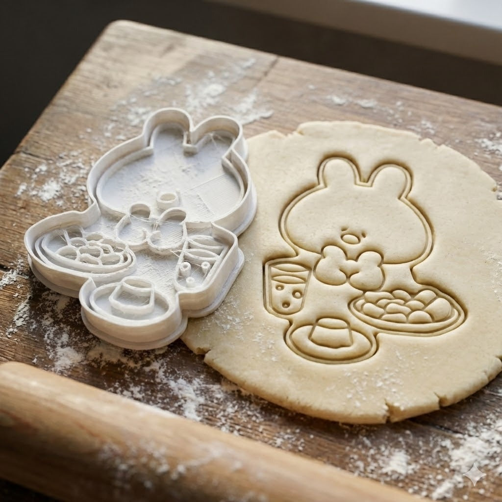 Adorable emporte-pièce en forme de lapin mignon tenant une boisson boba. Parfait pour créer des biscuits kawaii uniques qui raviront petits et grands.