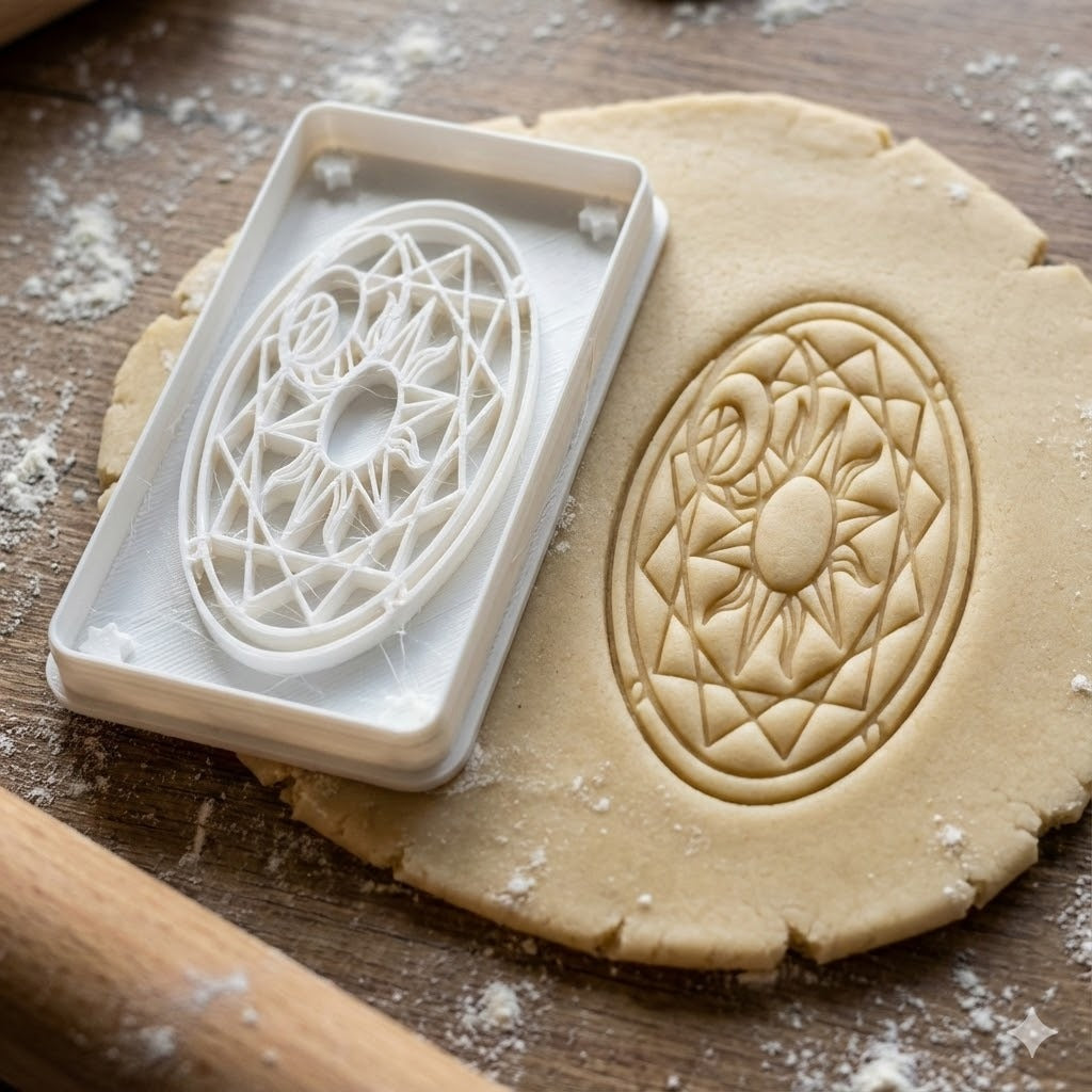 Magnifique emporte-pièce inspiré du dos des Cartes de Clow de la série Cardcaptor Sakura. Ce design détaillé présente le motif géométrique emblématique avec le soleil central entouré de motifs complexes.