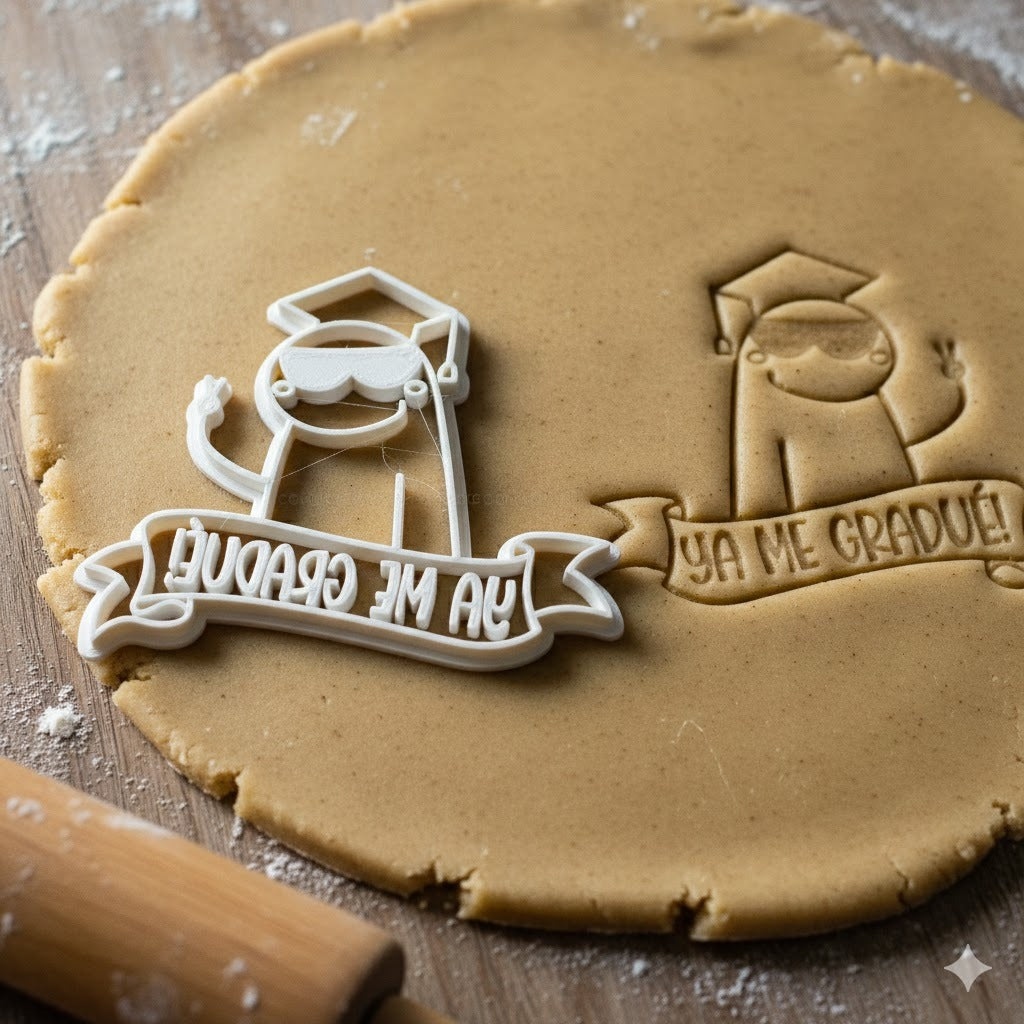 Emporte-pièce représentant le personnage Flork avec sa toge et son chapeau de diplômé, accompagné du message "Ya Me Gradué" (Je suis diplômé). Parfait pour célébrer les réussites académiques et créer des biscuits personnalisés pour les fêtes de remise de diplômes.