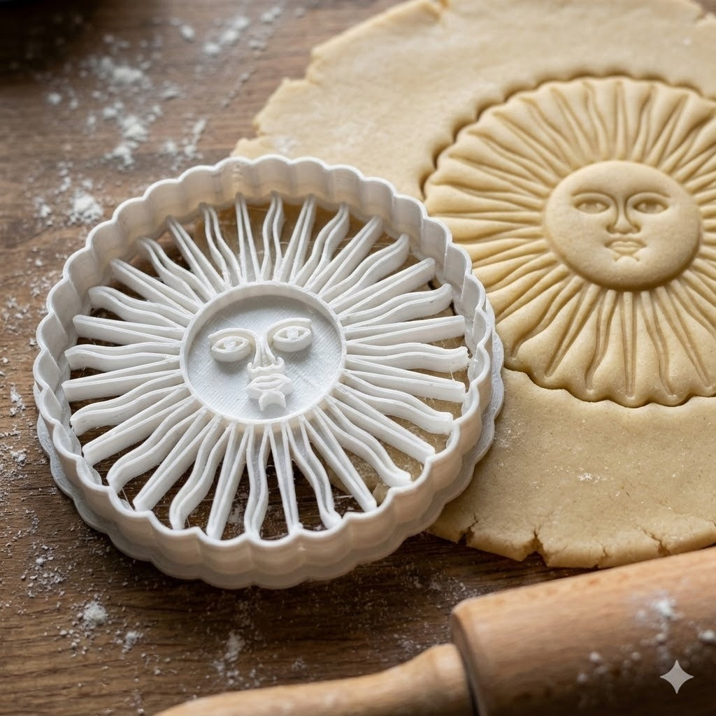 Magnifique emporte-pièce en forme de soleil argentin avec un visage expressif et des rayons détaillés. Parfait pour créer des biscuits décoratifs uniques et originaux.