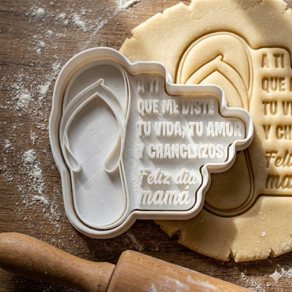 Emporte-pièce en forme de tong/chancla avec un message touchant et humoristique pour la fête des mères : "A ti que me diste tu vida, tu amor y chanclazos - Feliz día mamá"