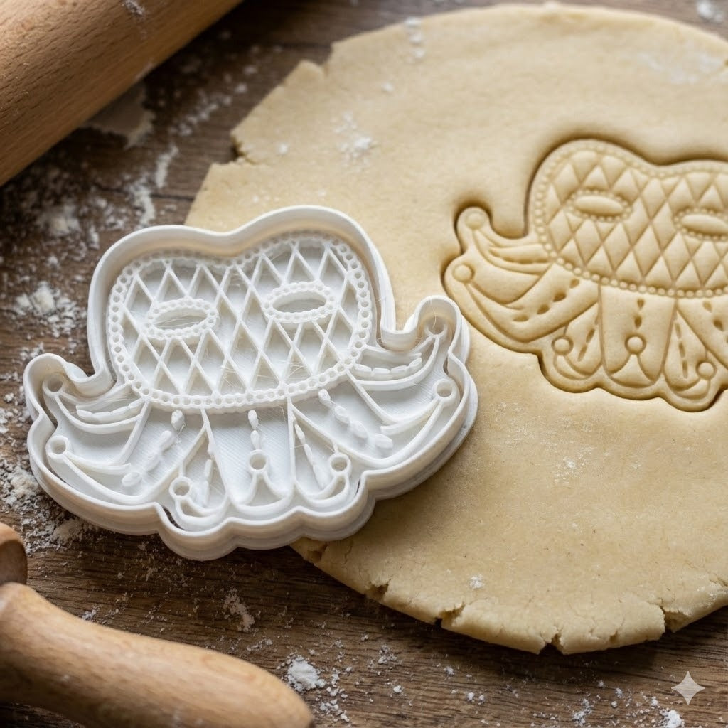 Magnifique emporte-pièce en forme d'éléphant orné de motifs décoratifs élégants. Ce tampon crée des biscuits avec des détails raffinés : motifs géométriques en losange, draperies festonnées et perles décoratives qui donnent un rendu sophistiqué à vos créations.