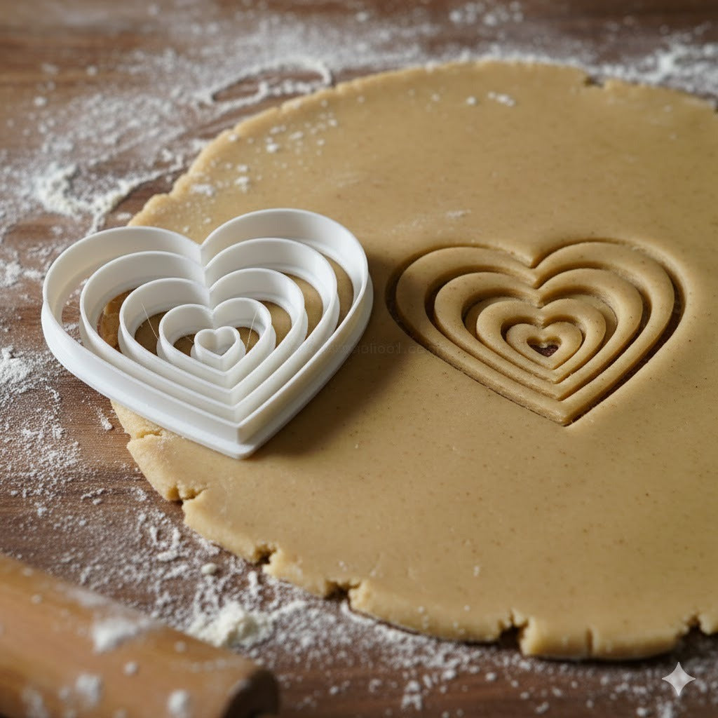 Magnifique ensemble d'emporte-pièces en forme de cœurs concentriques, parfait pour créer des biscuits romantiques et élégants.