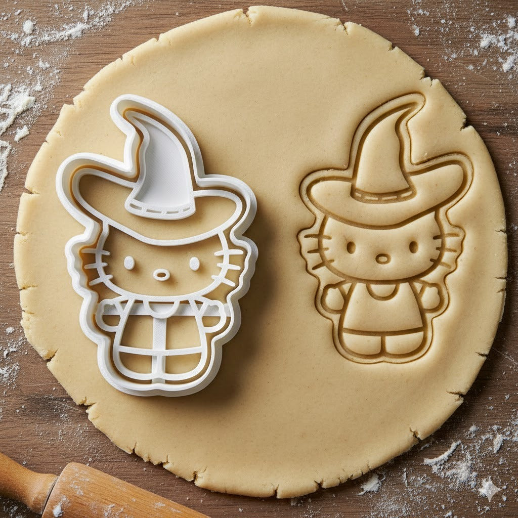Emporte-pièce Hello Kitty déguisée en sorcière, parfait pour créer des biscuits originaux pour Halloween ou toute occasion festive. Design détaillé avec le personnage emblématique portant un chapeau de sorcière et une tenue de magicienne.