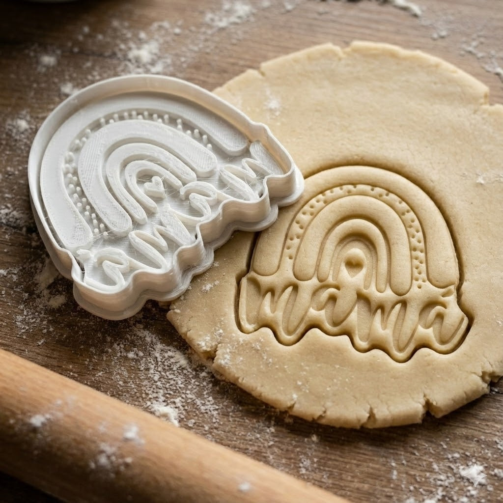 Emporte-pièce décoratif avec le mot "Mama" orné d'un magnifique arc-en-ciel. Parfait pour créer des biscuits personnalisés pour la fête des mères, les anniversaires ou toute occasion spéciale pour célébrer les mamans.