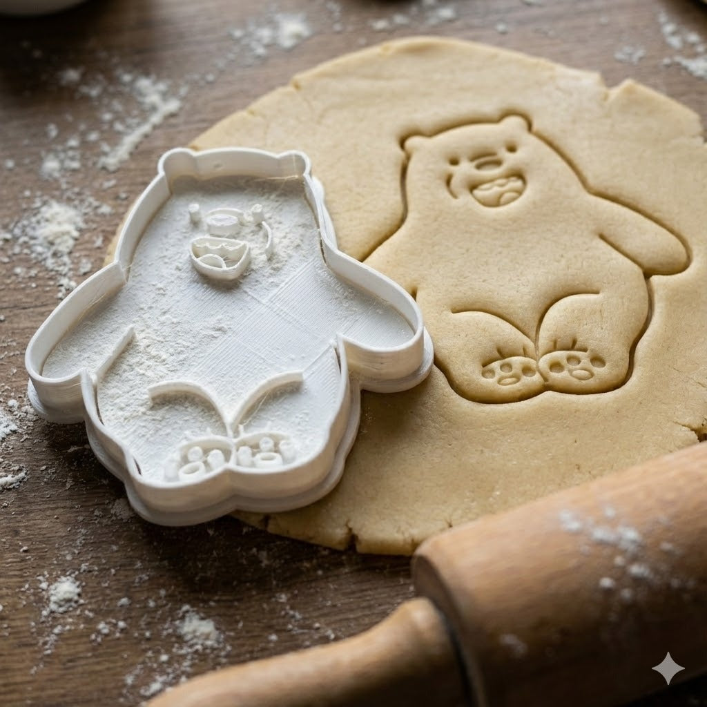 Adorable emporte-pièce en forme d'ours grizzly souriant, parfait pour créer des biscuits kawaii et amusants. Ce design détaillé capture l'expression joyeuse de l'ours avec ses pattes et son visage expressif.