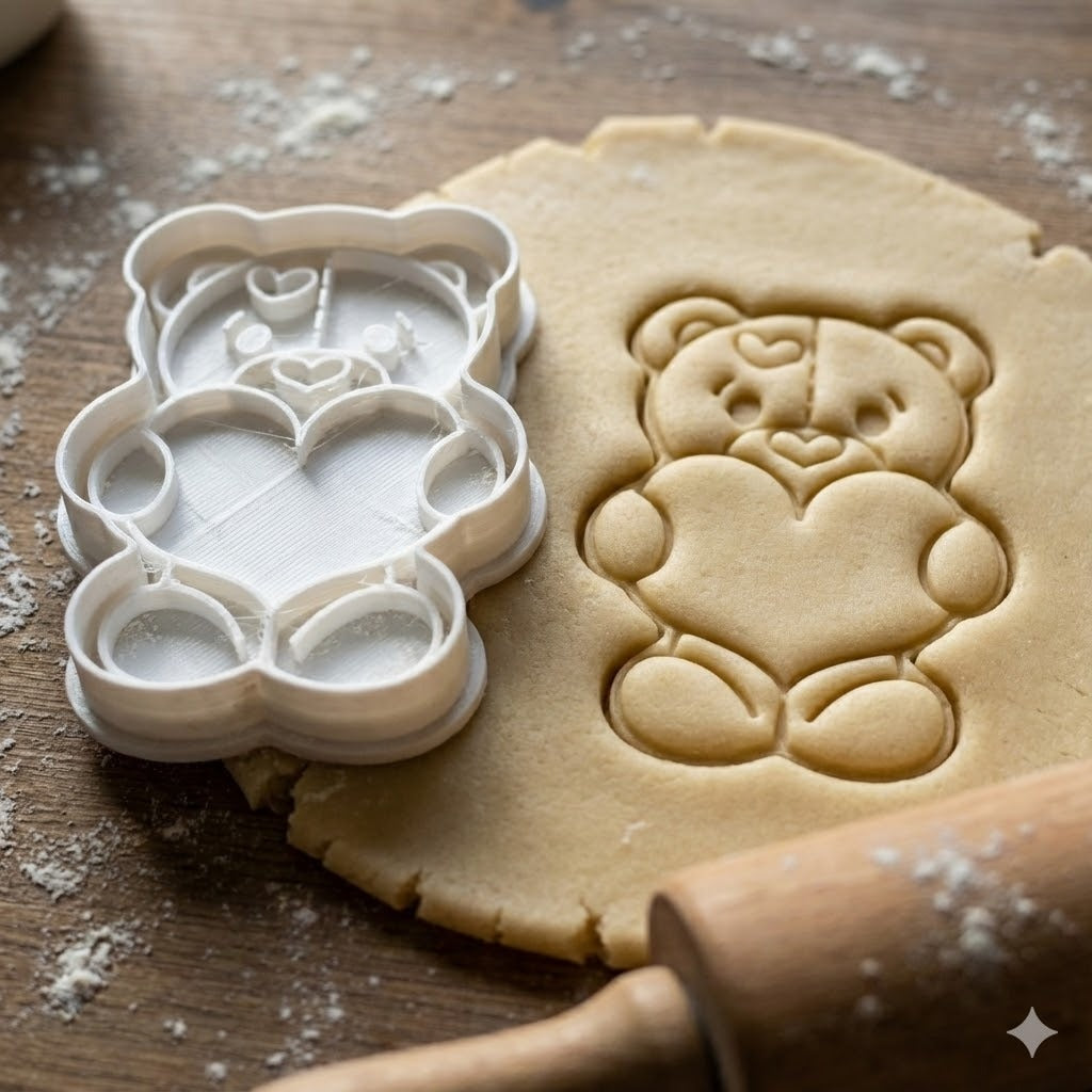Adorable emporte-pièce en forme d'ourson tenant un cœur, parfait pour créer des biscuits kawaii et mignons. Ce design détaillé capture l'expression douce de l'ourson avec ses petites pattes et son cœur sur le ventre.