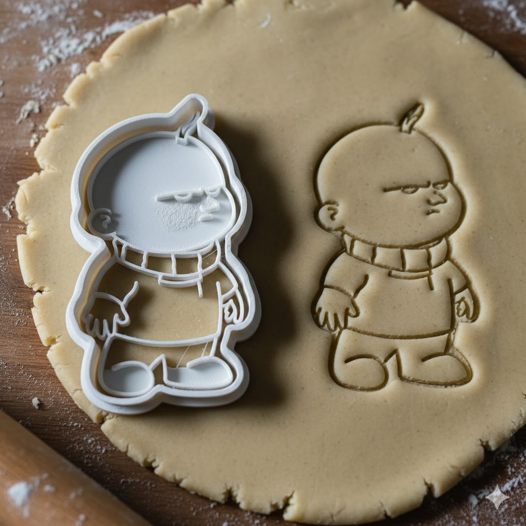 Emporte-pièce de qualité supérieure représentant un personnage cartoon adorable avec écharpe rayée. Parfait pour créer des biscuits originaux et amusants.