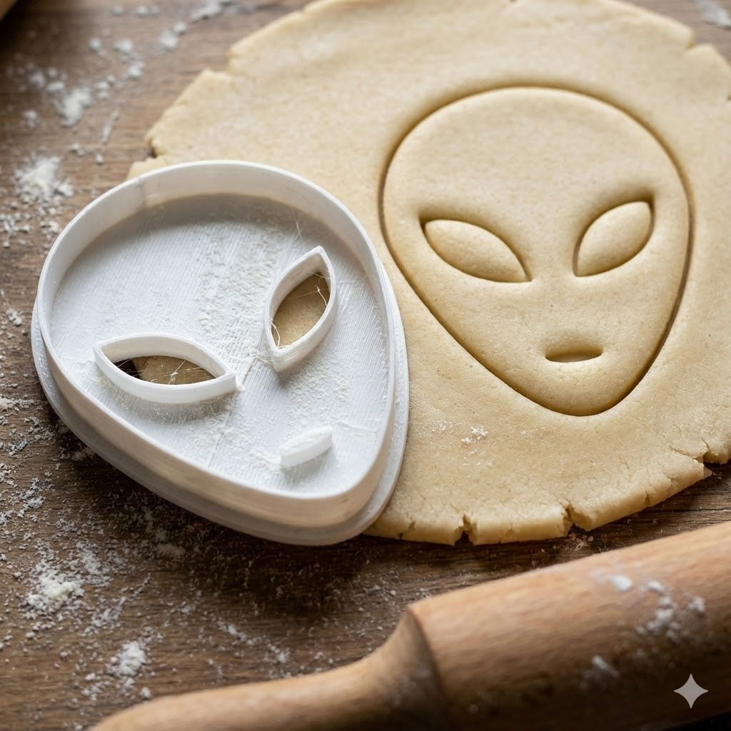 Emporte-pièce en forme de tête d'alien avec des yeux expressifs et des détails nets. Parfait pour créer des biscuits originaux sur le thème de l'espace et de la science-fiction.
