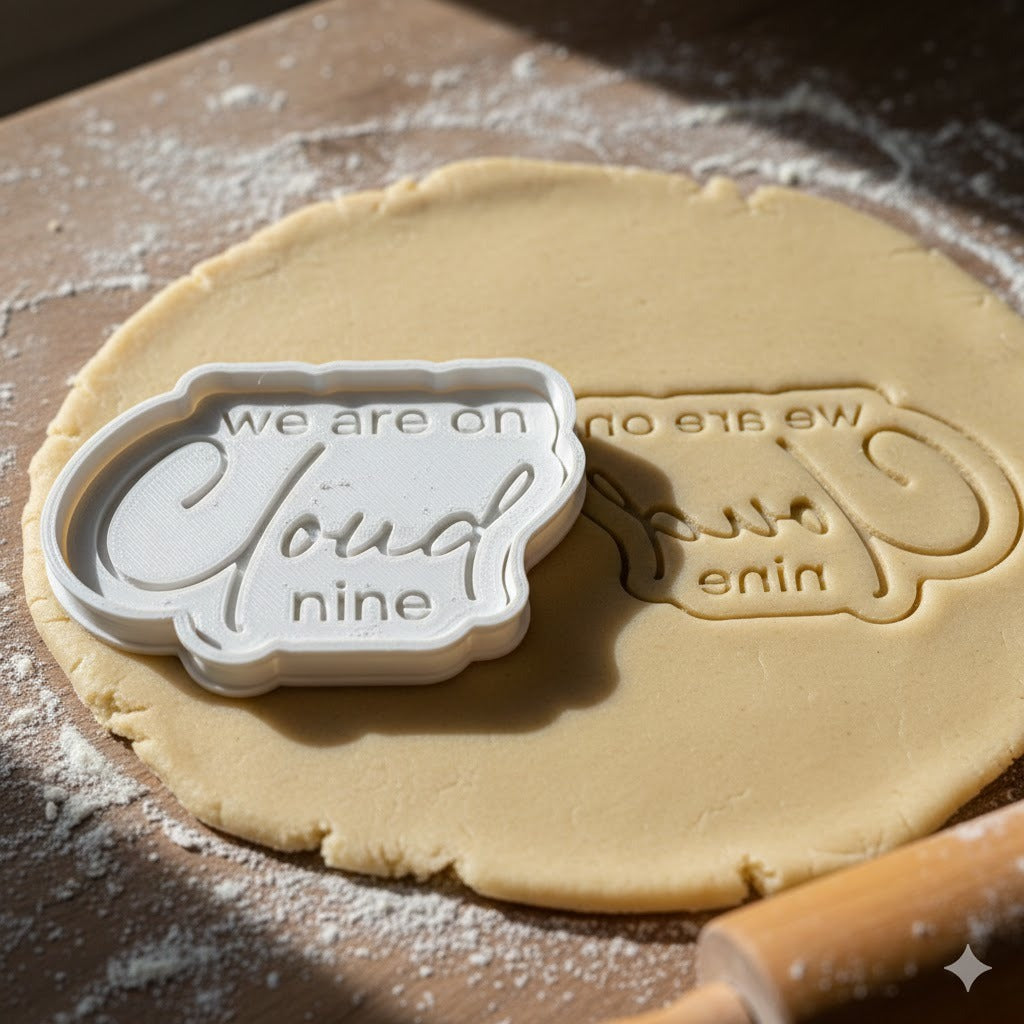 Ce tampon imprime un message élégant "we are on Cloud nine" avec une typographie soignée et un design en forme de nuage. Idéal pour les pâtissiers amateurs et professionnels qui souhaitent personnaliser leurs biscuits avec style.