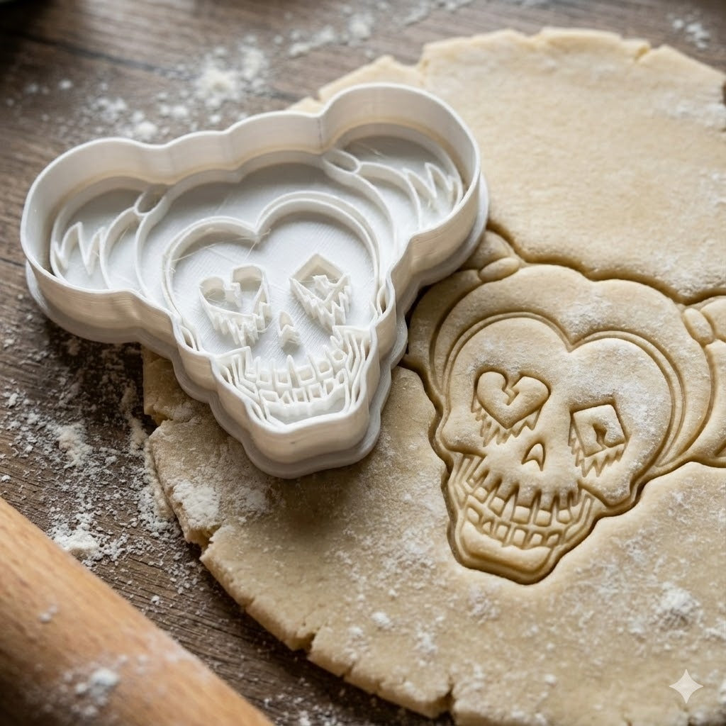Emporte-pièce en forme de crâne inspiré de l'univers de Harley Quinn, avec des détails de cœurs dans les yeux. Parfait pour créer des biscuits originaux et amusants pour vos événements à thème, fêtes d'anniversaire ou simplement pour les fans de l'univers DC.