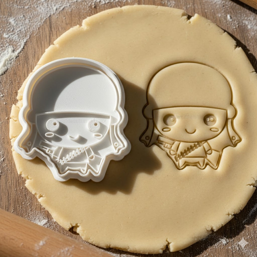 Emporte-pièce représentant un adorable personnage de soldat en style kawaii. Parfait pour créer des biscuits originaux et amusants.